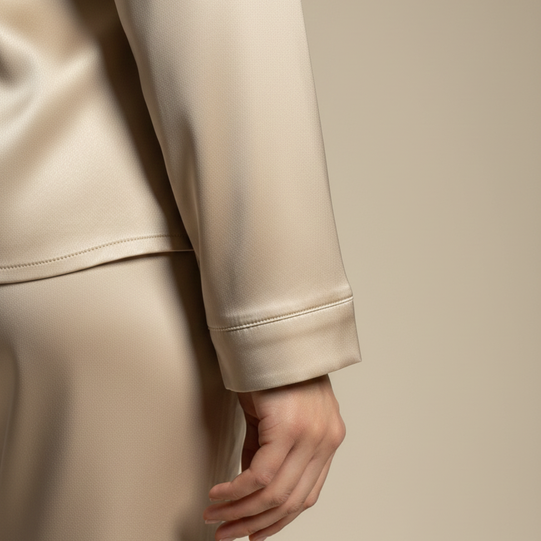 Изработена от първокласна коприна с висока плътност на нишките, тази пижама предлага несравнима мекота и фин блясък.
