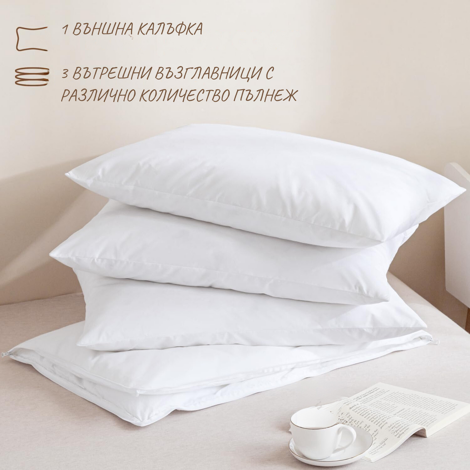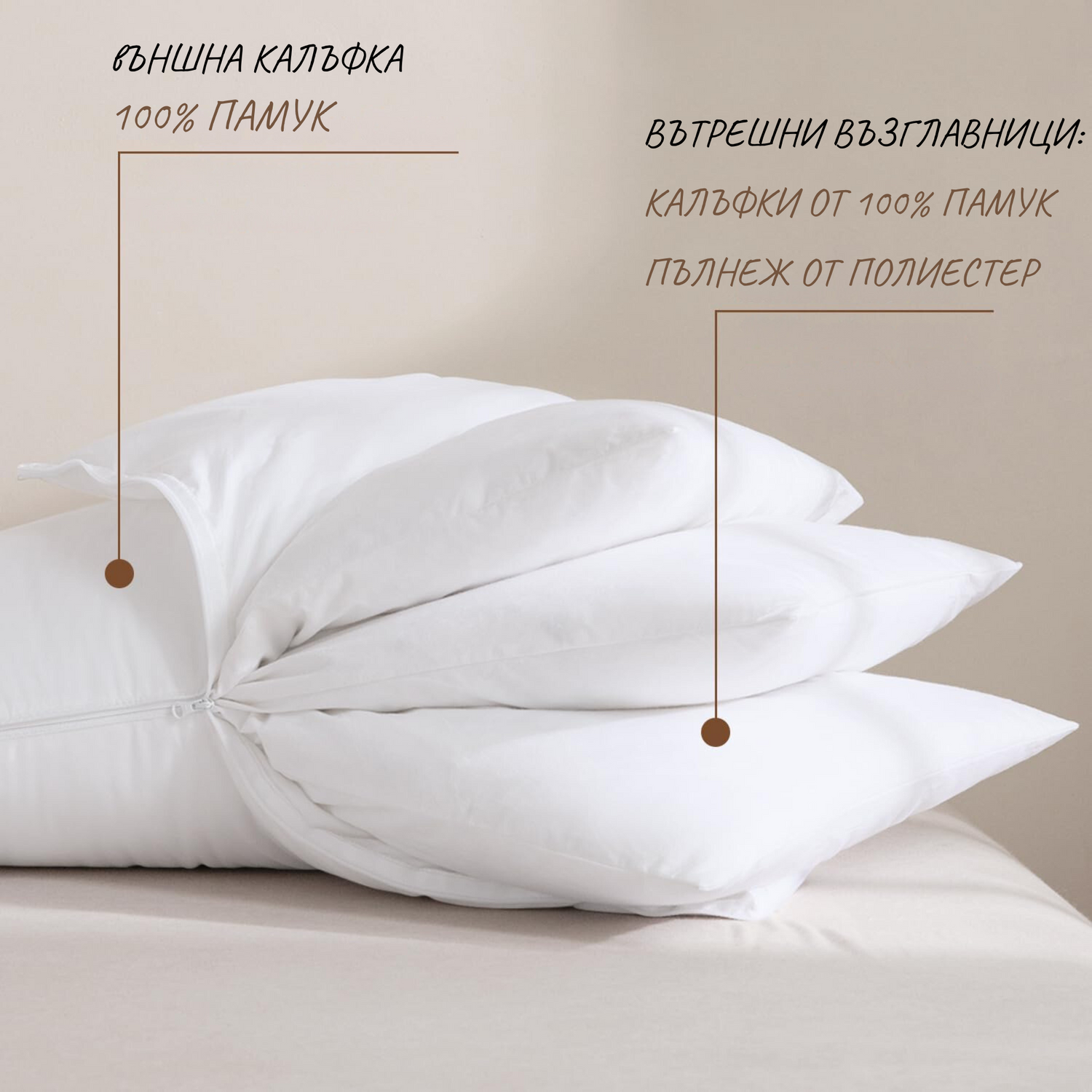 Щадящ кожата външен слой от 100% памук с издръжлив вътрешен слой от полиестер с висока плътност. Три броя вътрешни възглавници. (50х70 см.)